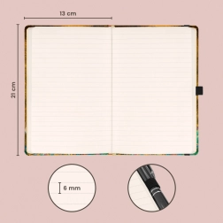 Pevné dosky chránia obsah v taške aj na cestách, gumička udrží zápisník bezpečne uzavretý, integrované pútko zaistí, že budete mať pero vždy po ruke, a vnútorné vrecko pojme vizitky či drobnosti. 172 strán žltého papiera ponúka dostatok priestoru pre všetky nápady.