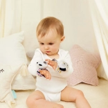 Ďalšou výhodou je, že chrastítka využívajú kontrastné farby a vzory na stimuláciu zraku a mäkký zvuk na aktiváciu sluchu. Materiál popruhu je navrhnutý tak, aby bol mäkký, čo umožňuje pohodlné nosenie a jednoduché uchopenie. Chrastítka sú ľahké a skladné, ideálne na prechádzky alebo výlety.