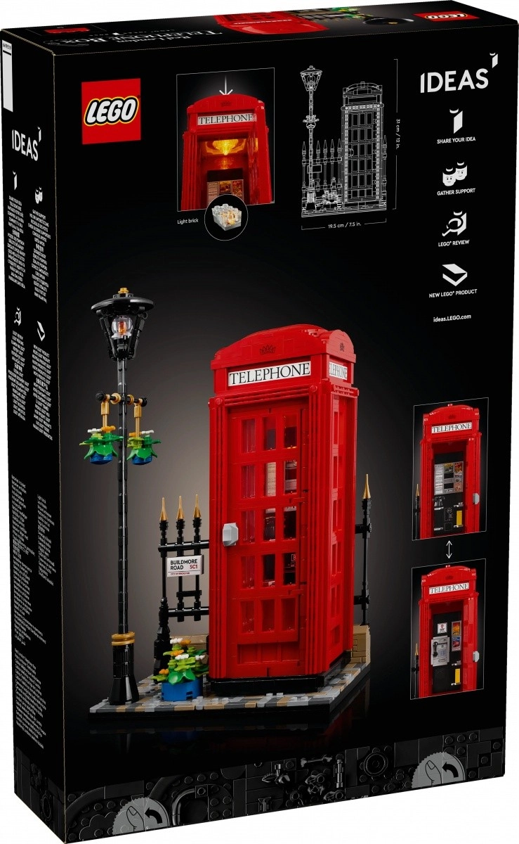 LEGO Ideas Červená Londýnska Telefónna Búdka je kreatívna stavebnica, ktorá verne zobrazuje klasickú britskú telefónnu búdku K2. Model zahŕňa svetelnú LEGO kocku na osvetlenie interiéru, čo dodáva autentickú atmosféru. S možnosťou voľby medzi retro telefónom alebo štýlom 80. rokov možno interiér prispôsobiť podľa osobných preferencií.