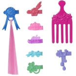 Súčasťou sady sú rôzne farebné doplnky pre štýlizáciu, ako je hrebeň, sponky a stuhy, ktoré podporujú kreativitu detí.