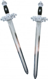 Súčasťou sady sú 2 identické strieborné meče s dĺžkou 49 cm s dekorovanými rukoväťami – ideálne na súboj alebo hru vo dvojici.