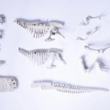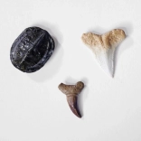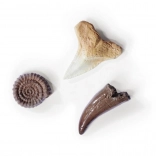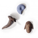 Skamenené repliky fosílií v sade predstavujú historické biologické formy vrátane zubov a špirálových fosílií.