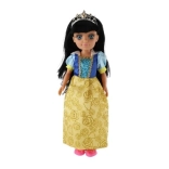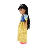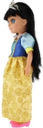 Bábika má dlhé čierne vlasy, modré oči a nosí krásne šaty v modro-žltej kombinácii s ružovými topánkami.