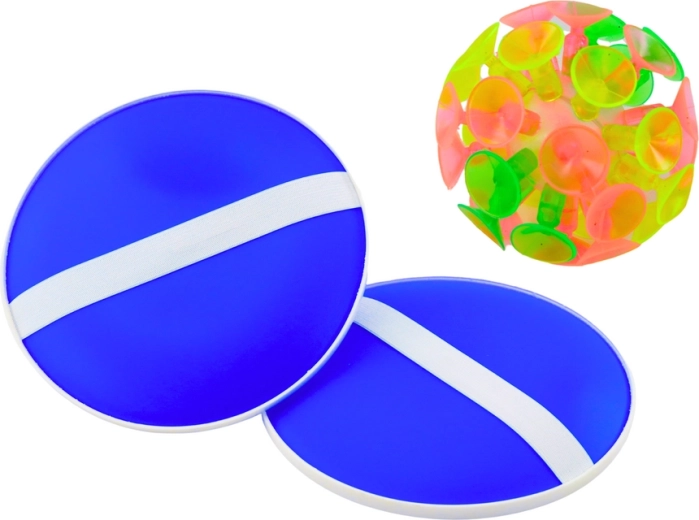 Hra obsahuje dve okrúhle modré pálky s prísavkami a jednu ľahkú loptičku, ideálnu pre dynamickú hru na čerstvom vzduchu.
