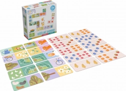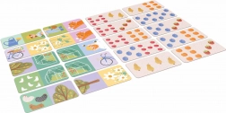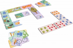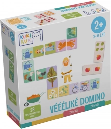 Hra ponúka dve varianty v jednom: obrázkové domino s motívmi zo záhrady (zvieratá, záhradníci a náradie) a klasické domino, kde bodky nahrádzajú rôzne druhy ovocia. Vďaka veľkým, odolným dielikom 12 × 6 cm je hra vhodná aj pre menšie deti a podporuje učenie hrou.