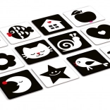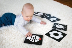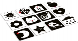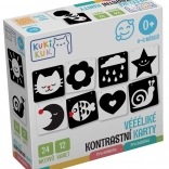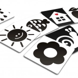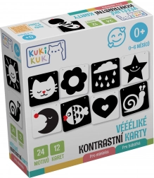Kontrastné karty KukiKuk sú ideálnou prvou „hračkou“, s ktorou môžete začať už od narodenia. Novorodenci vnímajú predovšetkým výrazné kontrasty – preto na nich čiernobiele obrázky účinne pôsobia, podporujú rozvoj zraku, pozornosti aj rané kognitívne zručnosti. Karty sú dostatočne veľké, z pevného materiálu a navrhnuté tak, aby zaujali a zároveň nepreťažovali.