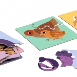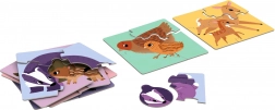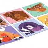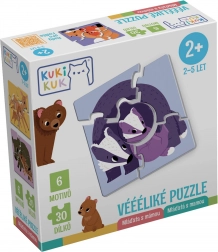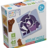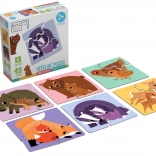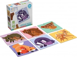 Táto sada obsahuje šesť štvorcových puzzle s ilustráciami zvieracích rodiniek – medveď, líška, jazvec, diviak, srnka a vtáčik. Každý motív sa skladá zo štyroch veľkých dielikov s výslednou veľkosťou cca 15,5 × 15,5 cm. Rovnaké tvary spojovacích zámkov vedú deti k systematickému skúšaniu a správnemu priraďovaniu, pričom stredové dieliky mláďat majú pri všetkých motívoch zhodný tvar.