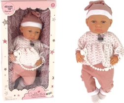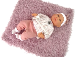 Táto realistická bábika je veľkosťou aj spracovaním podobná skutočnému bábätku. Má mäkké látkové telíčko a hlavičku, ručičky aj nožičky z príjemného materiálu pre pohodlné hranie. Je oblečená do bielo-modrého kompletu: modrý svetrík, čiapočka a ponožky s bielymi nohavičkami – všetko k sebe perfektne ladí.