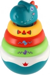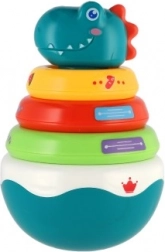 Táto hravá skladacia pyramída s motívom dinosaura spája zábavu a učenie. Zaoblený podstavec sa pri ťuknutí kolíše do všetkých smerov a aktivuje príjemný zvuk rolničky, ktorý prirodzene stimuluje sluch. Deti si precvičia úchop, triedenie krúžkov podľa veľkosti a spoznávanie farieb – ideálne na prvé objavovanie sveta.