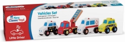 Táto súprava obsahuje štyri farebné a odolné drevené vozidlá: policajné auto, hasičské auto, sanitku a taxi. Hra s týmito vozidlami napomáha rozvoju hrubej motoriky a predstavivosti. Každé vozidlo je navrhnuté tak, aby bolo bezpečné a zábavné pre najmenšie deti.