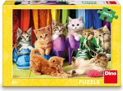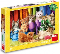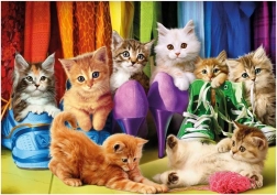Veselý obrázok mačiatok medzi topánkami a klbkami motivuje deti k skladaniu a po dokončení ozdobí detskú izbu.