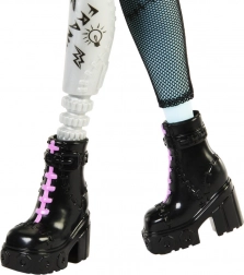 Zoznámte sa s ikonickou študentkou MONSTER HIGH – Frankie Stein. Táto bábika vyniká pôsobivým mixom punk a techno štýlu: džínsová bunda, šortky, výrazné náušnice v tvare bleskov a čierne členkové topánky s ružovým šnurovaním. Vďaka kĺbom na nastavovanie póz ľahko vytvoríte cool scény a príbehy.