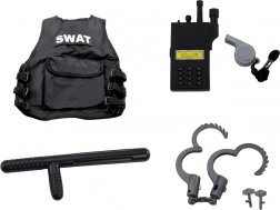 - Realistické doplnky: vesta, obušok, putá, píšťalka, vysielačka