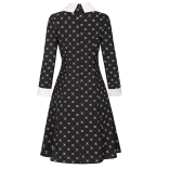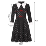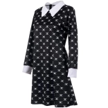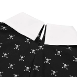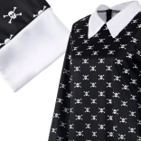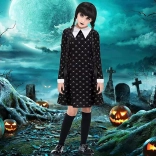 Štýlový detský kostým inšpirovaný postavou WEDNESDAY ADDAMS: čierne šaty s bielym golierom, manžetami a potlačou lebiek. Pružný materiál pre pohodlné nosenie, ideálny na Halloween, karneval aj tematické večierky.