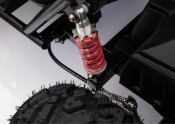 Veľké kolesá s hrubým dezénom a výkonné odpruženie zabezpečujú výbornú trakciu a stabilitu na tráve, štrku aj v ľahkom teréne.