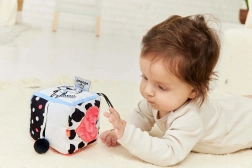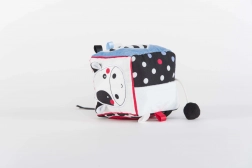 Táto mäkučká senzorická kocka je navrhnutá pre najmenších prieskumníkov. Každá zo šiestich strán prináša iný zmyslový zážitok – od kontrastných čiernobielych vzorov s farebnými akcentmi až po rozmanité textílie a povrchy, ktoré lákajú k dotyku a objavovaniu. Roztomilé motívy kravy a tigra podnecujú zvedavosť a učia dieťa vnímať tvary a emócie.