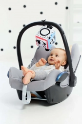Vystupujúce prvky ako kravské ušká a tigrí chvostík uľahčujú uchopenie a trénujú stisk. Praktické vrecko s plyšovou loptičkou na šnúrke podporuje vkladanie a vyberanie, čo je skvelé pre koordináciu oko–ruka. Integrované bezpečné detské zrkadielko priťahuje pozornosť a pomáha rozvíjať vnímanie vlastného odrazu, zatiaľ čo štítky/stužky na ďalšej strane stimulujú hmat a prsty.
