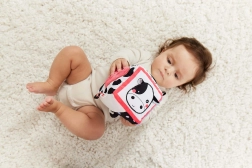 Vysoký kontrast čiernobielych motívov s farebnými detailmi stimuluje zrak a udrží pozornosť bábätka počas hry.