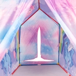 Farebný detský stan v tvare domčeka prináša kúzelný priestor na hranie doma aj vonku. Ľahká konštrukcia umožní rýchlu montáž a jednoduché prenášanie, rolovacie vchody podporujú bezpečné a kreatívne hranie. Veselé motívy jednorožcov a dúhy zaujmú každé dieťa.