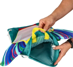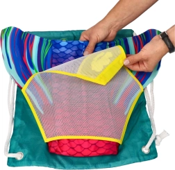Sieťované časti a vzdušný materiál pomáhajú obsahu rýchlejšie vysychať po plávaní, takže je vak pripravený na ďalšie použitie.