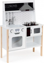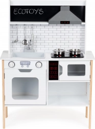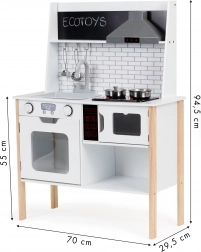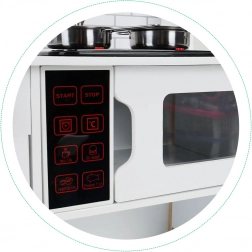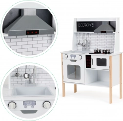 Táto detská kuchynka z masívneho dreva ponúkne všetko, čo malí MasterChefi potrebujú: osvetlené platne so zvukom varenia, praktickú rúru, mikrovlnku a priestranné skrinky na uloženie doplnkov. Hornú časť dopĺňa digestor a háčiky na náradie, takže bude vždy všetko po ruke.
