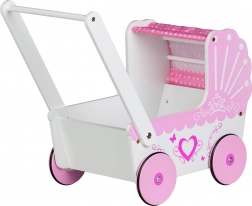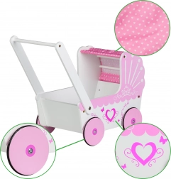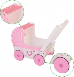 PREVEDENIE: Kočík je vyrobený z dreva a v príjemnej farebnej kombinácii. Na bielom prevedení sa nachádzajú ružové srdiečka. Ružové sú aj kolieska, strieška aj vnútorná výstelka.