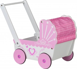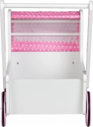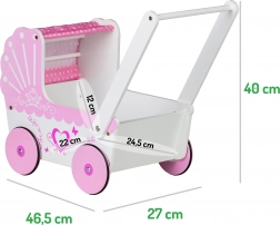 DOPLNKY: Vnútro kočíka je vystlané mäkkou plachtou v ružovej farbe. Do kočíka je možné uložiť bábiky, plyšáky alebo aj iné hračky. Nad hračkami môžete zatiahnuť striešku, na ktorej je umiestnená ružová látka.
