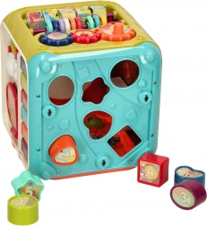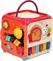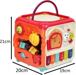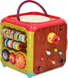 Súčasťou je aj obľúbená hra „nakŕm vtáčika“ s magnetickými chrobáčikmi a hojdajúcou sa sovičkou, rovnako ako farebné kocky do sortera tvarov. Vďaka praktickému držadlu je kocka ľahko prenosná a ideálna na domáce aj cestovné hranie.