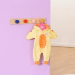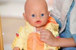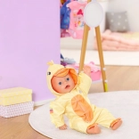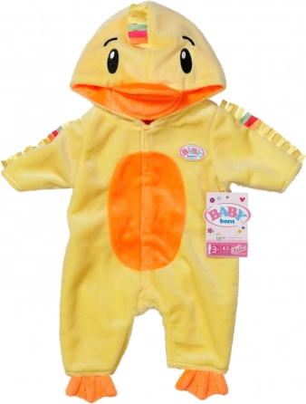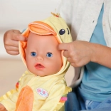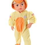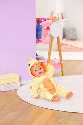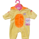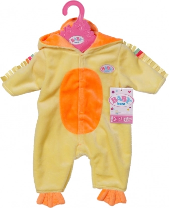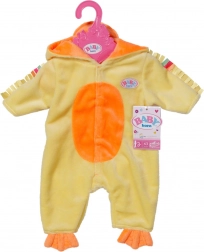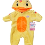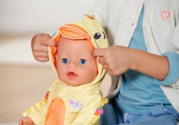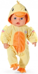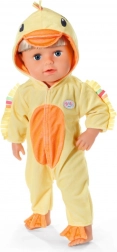 Mäkký kačací overal pre bábiky BABY born vo veľkosti 43 cm premení hru na maznacie dobrodružstvo. Kapucňa so zobáčikom, kontrastné oranžové bruško a „plávacie“ nožičky dotvárajú rozkošný vzhľad, zatiaľ čo predný zips uľahčuje prezliekanie a nácvik jemnej motoriky.