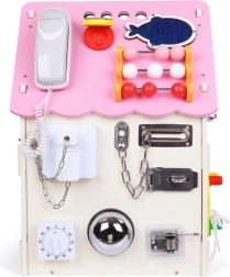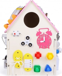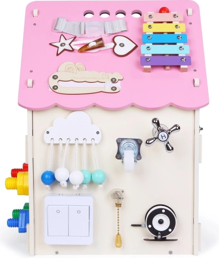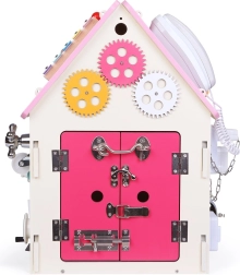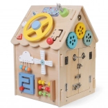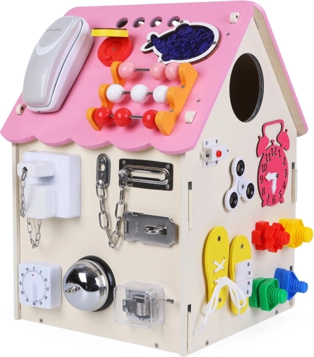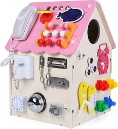 Interaktívny drevený domček s množstvom prvkov na zmyslové skúmanie a učenie rozvíja jemnú motoriku, koordináciu ruka-oko a samostatnosť. Deti si zábavnou formou precvičia zapínanie, zaväzovanie, prepínanie, otáčanie a odomykanie, zároveň sa zoznámia s počítadlom a hodinami.