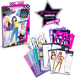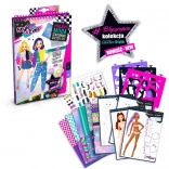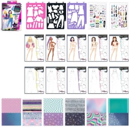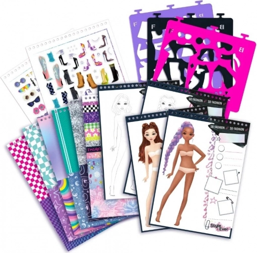 Sada obsahuje papierové šablóny, farebné vzorové listy a plastové šablóny, ktoré podporujú kreativitu a umožňujú navrhovať oblečenie.