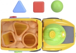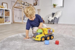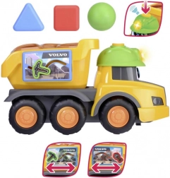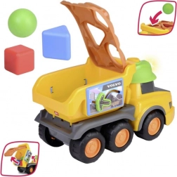 Žlté Volvo nákladné autíčko s veselým dizajnom a farebnými kockami na tvarový sorter je ideálne pre rozvoj motorických zručností.