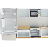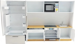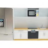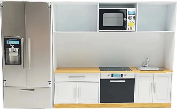 Sada obsahuje všetko, čo potrebujete na vytvorenie plne vybavenej kuchyne. Maličké domáce spotrebiče – rúra, mikrovlnná rúra, chladnička, mraznička a dokonca aj výrobník ľadových kociek!