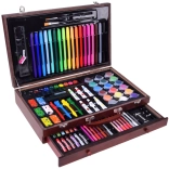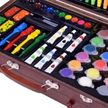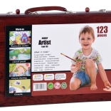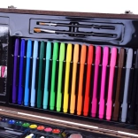 Drevený kufrík s rozmermi 37 cm x 23 cm x 7,5 cm zabezpečuje jednoduché prenášanie a uloženie všetkých výtvarných potrieb.