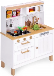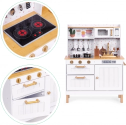 Drevená kuchynka pre deti so zvukmi a LED svetlami, veľká, s otváracími skrinkami a 7 doplnkami, ECOTOYS