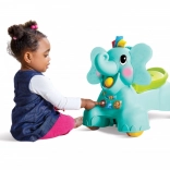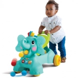 Interaktívny panel so svetlami, tlačidlami s číslami a melódiami prebúdza zmysly a učí súvislosti, zatiaľ čo mäkké uši s masážnymi výstupkami slúžia ako bezpečné hryzátka. Chobot slona zábavne zbiera rozhádzané loptičky a vyhadzuje ich späť do predného košíka alebo na podlahu; ďalšie loptičky možno uložiť do priestoru pod sedadlom. Pre istotu rodičov aj stabilitu dieťatka možno regulovať rýchlosť kolies.