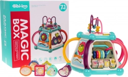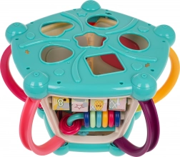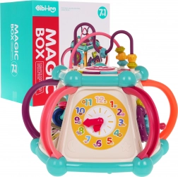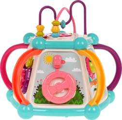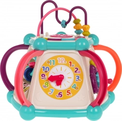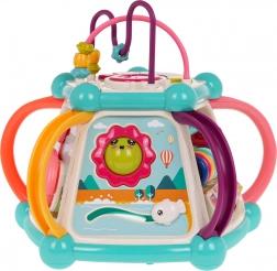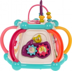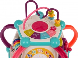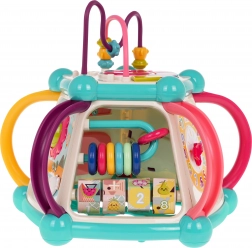 Táto farebná multifunkčná kocka je vyrobená z kvalitného, bezpečného plastu a je ideálna na prvé objavovanie sveta. Sedem herných plôch ponúka rozmanité aktivity: horný panel s prekladačkou, dvojstupňovým ovládaním hlasitosti a pianínkom so zvukmi psíka, mačičky, ovečky aj kačičky, bočné strany s počítadlom, hodinami s ručičkami, ozubenými kolieskami a medvedíkom, volantom s autíčkom a zábavnou rybkou so slniečkom. Spodná strana ukrýva triediaci otvor pre tvary a 6 farebných kociek.