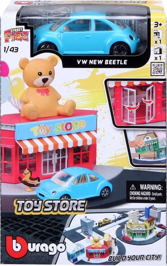 Postavte si vlastné mesto s hernou sadou Bburago City Hračkárstvo 1:43. Kovový model auta v mierke 1:43, plastová budova s pohyblivými dverami, pouličné a chodníkové prvky a rôzne doplnky pre kreatívne hranie. Sadu možno kombinovať s ďalšími setmi série StreetFire.