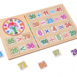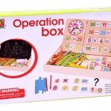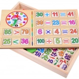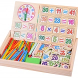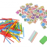 - Kompletný set: tabuľka, číslice 0–9, matematické symboly (+, −, ×, ÷, =), počítacie tyčinky, farebné kriedy, hubka.