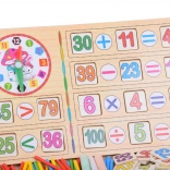 Táto multifunkčná sada podporuje prirodzené učenie detí predškolského a mladšieho školského veku. Drevená konštrukcia zabezpečuje odolnosť a príjemný hmatový zážitok, zatiaľ čo pestré farby motivujú k objavovaniu čísel, tvarov a jednoduchých príkladov. Vďaka uzatvárateľnému boxu máte všetko prehľadne na jednom mieste – ideálne doma aj na cesty.