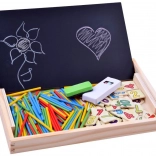 Všetky dieliky sú uložené v odolnom drevenom boxe. Veko slúži ako tabuľka, takže učenie je vždy poruke.