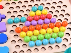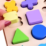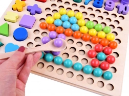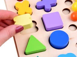 Drevená doska s tvarmi, číslami a symbolmi učí správnemu priraďovaniu, rozpoznávaniu tvarov a podporuje logické myslenie pri skladaní.
