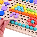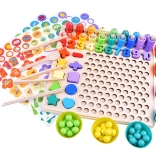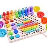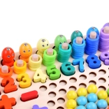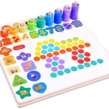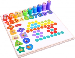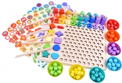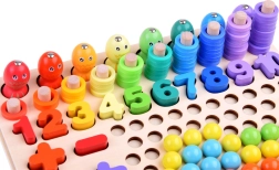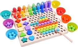 Táto komplexná sada do detskej izby prináša pestrú paletu hier a úloh, ktoré podporujú učenie prostredníctvom hry. Deti si precvičia rozpoznávanie tvarov a farieb, naučia sa čísla a množstvá a vďaka magnetickej udici si užijú aj obľúbené rybárčenie. Súčasťou je tiež skladanie vzorov z korálikov a guličiek podľa predlôh – skvelé pre sústredenie a trpezlivosť.