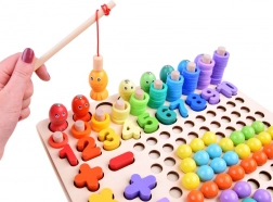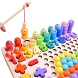 Chyťte farebné rybičky pomocou drevenej udice s magnetom a umiestnite ich na správne miesta. Zábavná aktivita posilňuje koordináciu oko–ruka a trpezlivosť.