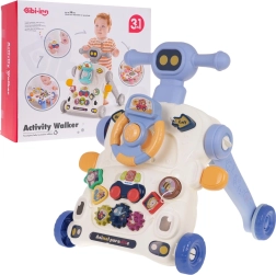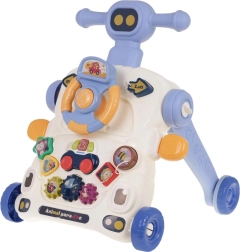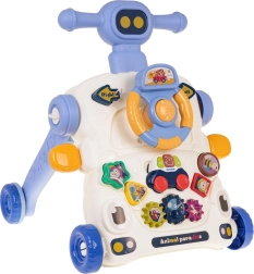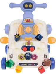 Toto multifunkčné chodítko poteší rodičov aj deti: slúži ako opora pri prvých krôčikoch a zároveň ako stolík s aktivitami pre hravý rozvoj. Panel ponúka volant s píšťalkou, prevody, tvarový triedič a mini kôš na hádzanie loptičkou – všetko navrhnuté tak, aby posilňovalo koordináciu, sústredenie a motorické zručnosti.
