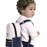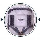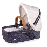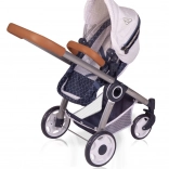 Kočík zaujme elegantným španielskym dizajnom s prešívanými detailmi a imitáciou dreva na madlách. Nechýba bezpečnostný trojbodový pás, mäkké polstrovanie a priestranný kôš na nevyhnutnosti. Súčasťou je aj štýlový batôžtek, ktorý možno pripnúť na kočík alebo nosiť na chrbte.