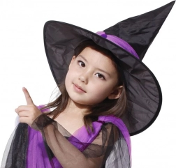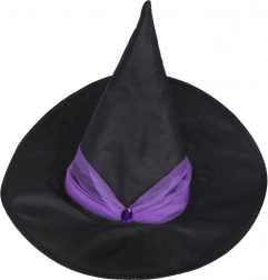 Klasický čierny klobúk s fialovým zdobením dokonale doplní kostým a podčiarkne čarodejnícku atmosféru.