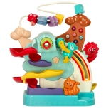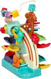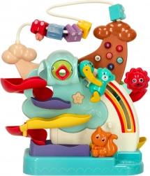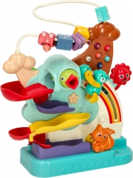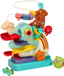 Jasné farby a plynulý pohyb guľôčok posilňujú zrakové vnímanie, zatiaľ čo manipulácia s prvkami kultivuje jemnú motoriku. Dieťa sa zároveň nenútene zoznamuje s číslami a učí sa príčinným súvislostiam.