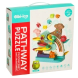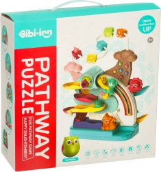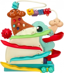 Farebné guľôčky a malé autíčko svištia po dvoch úrovniach dráh, ktoré podporujú sústredenie a koordináciu. Deti baví sledovať pád guľôčok a skúšať nové kombinácie.