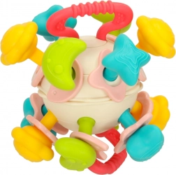 Táto ľahká a ľahko uchopiteľná senzorická hračka kombinuje plastové a silikónové prvky, ktoré deti lákajú k objavovaniu. Kontrastné farby a viac druhov povrchov podporujú zrakovú aj hmatovú stimuláciu, zatiaľ čo jemný hrkajúci zvuk rozvíja sluchové vnímanie.
